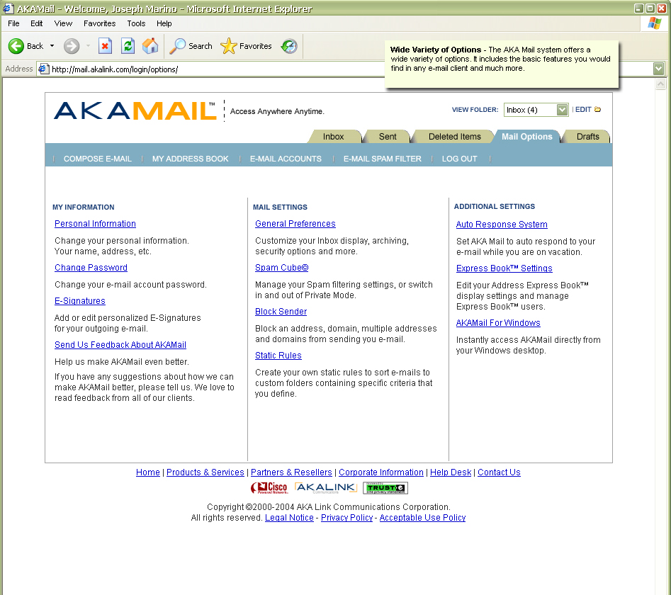 In hindsight, AKA Mail seems basic, but it was innovative for its time. To put the innovation into perspective, we launched AKA Mail in July of 2003, which was almost 1-year before Google launched Gmail in April of 2004.