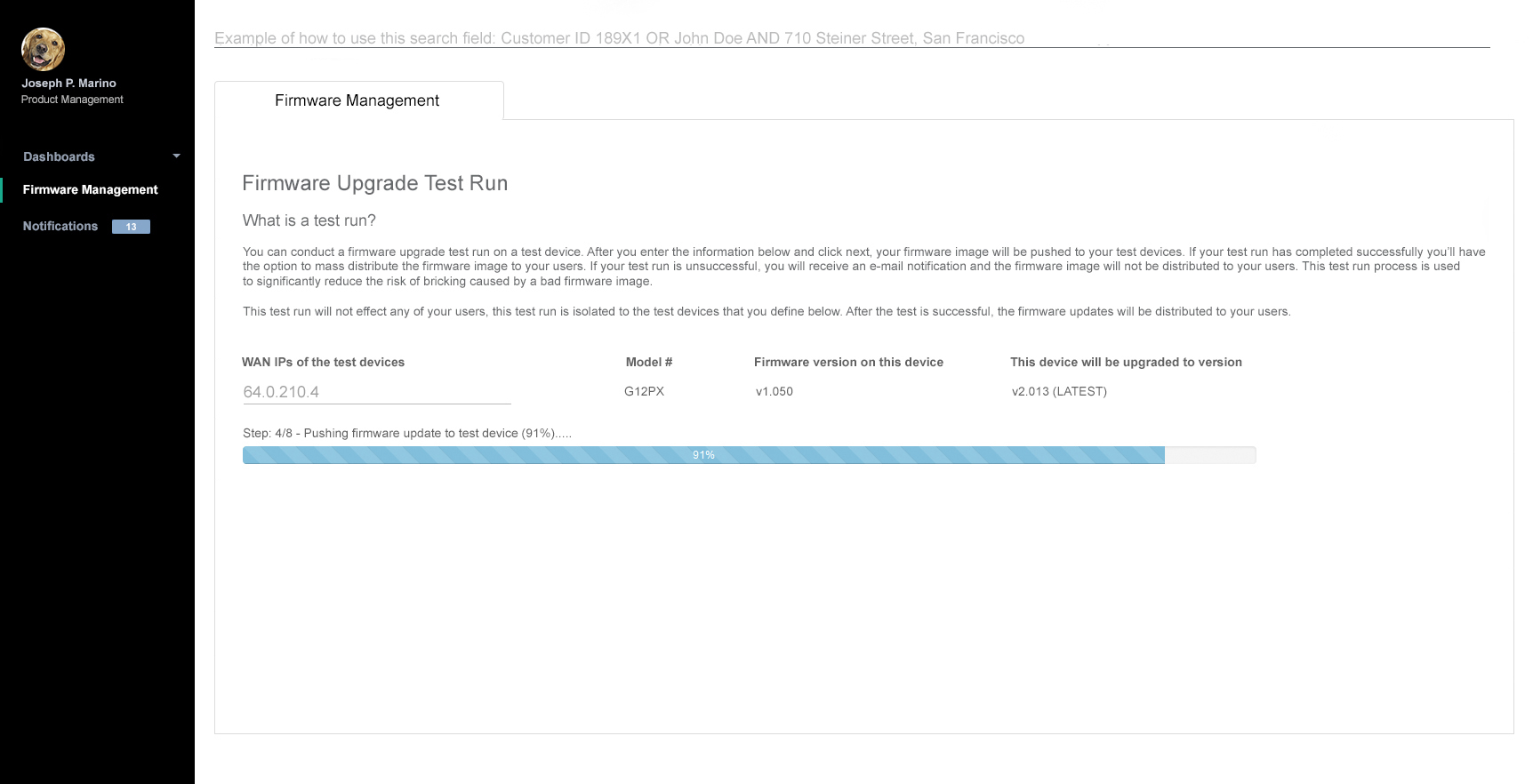 device bricking. Today, the Remote Firmware Upgrader is licensed by 10 wireless networking OEMs and is in use in millions of wireless routers worldwide. A notable licensee is a Fortune 500 technology company with a market capitalization exceeding $100B.